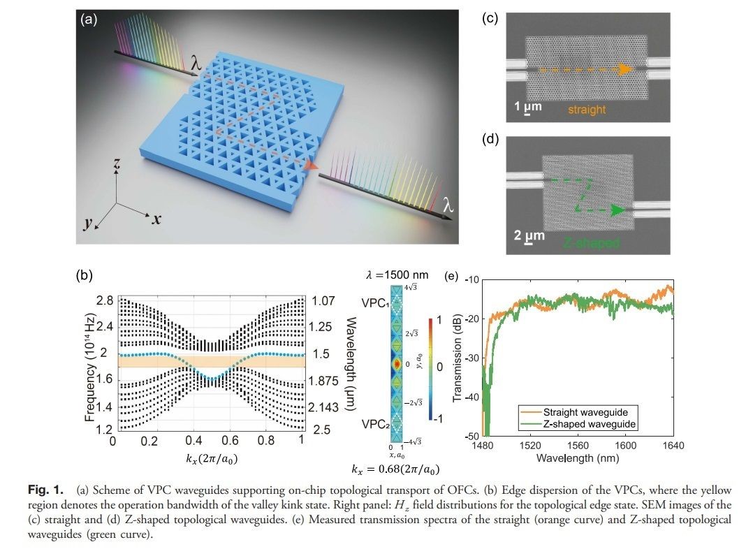 姜淳教授等团队通过实验首次揭示了量子频率梳在拓扑谷光子晶体波导中的鲁棒片上传输特性。集成光子学中的光学频率梳在高维光学计算、大容量通信、高速互连等颠覆性技术中具有广泛应用。然而,具备高维量子态的量子频率梳容易受到退相干效应的影响,在存在尖锐弯曲等微扰时尤为明显。姜淳教授团队通过测量量子频率梳的时间关联特性和联合光谱强度,发现由于拓扑量子谷霍尔效应的特性,量子关联性和频率纠缠态即使在尖锐弯曲条件下仍能保持稳定。此外,实验证实带宽达20 THz的耗散克尔孤子频率梳在结构微扰下依然能维持其光谱包络和低噪声特性。这类具备拓扑保护的光学频率梳为高维光子信息处理领域提供了兼具鲁棒性、复杂调控性、高可控性和可扩展性的光源方案,将有力推动该领域的技术进步。
